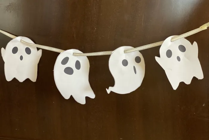 Decorate the house with this Ghost Halloween bunting. Download and cut out the activity sheet. Be sure to measure up and count how many ghosts you'll need and print! Cut out small holes and thread ribbon or string through and hang!