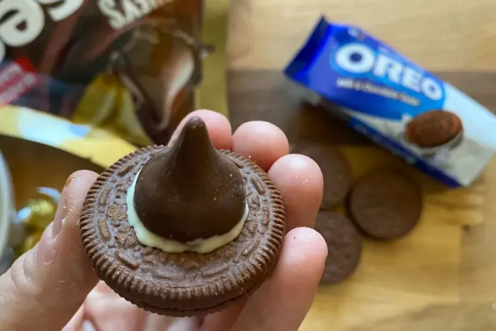 With only 3-ingredients, you can make so easy and delicious no bake Halloween treat! Put melted chocolate or icing on the bottom of Hershey Kiss then press it down on top of Oreo cookie and let it set.