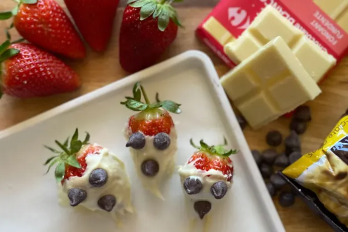 Turn some fresh strawberries into Halloween-ish ghosts and get in the festive spirit! Dip some fresh strawberries into melted white chocolate then attach mini chocolate chips to make the ghost eyes and mouth, refrigerate them and enjoy your not so scary ghost.