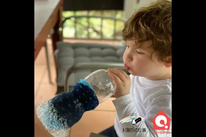 إليك لعبه سهلة و بسيطة سوف يستمتع بها طفلك! قم بقص قاع علبة الماء واتركها جانبا. ثم قم بإدخال جورب مناسب غير واسع من الأسفل واسحبه للأعلى بإحكام. تأكد من عدم تغطية فوهة العلبة! اغمس قاع علبة الماء المغطاة بالجورب في وعاء به خليط من الفيري والماء. الآن كل ما عليك فعله هو النفخ في فوهة العلبة ومشاهدة فقاعات الصابون تظهر
